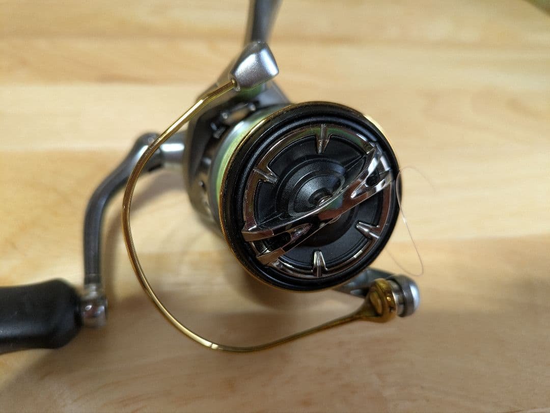金色のアクセントが特徴のスピニングリール。- スプールの色: シルバー- ハンドルの色: ブラック- ラインの色: ホワイト- 特長: 金色のアクセントご覧いただきありがとうございます。
